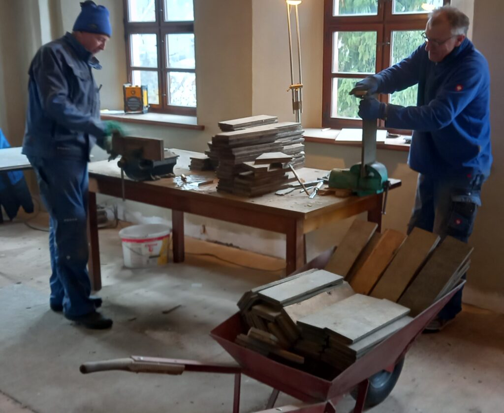 Lotterhoffreunde, vorwiegend Rentner, sind seit ca. 3 Wochen bei kühlen Temperaturen damit beschäftigt, um den Fortgang der Verlegearbeiten zu gewährleisten. Allen Freiwilligen gilt dafür ein ganz herzliches Dankeschön, werden doch dadurch beachtliche Kosten eingespart. Inwieweit das historische alte Parkett, vermutlich Ende des 19. oder Anfang des 20. Jahrhunderts in Döbeln hergestellt (Parkettfabrik Julius Grössler), für 3 Räume des 2. OG ausreicht, kann zum gegenwärtigen Zeitpunkt noch nicht gesagt werden.