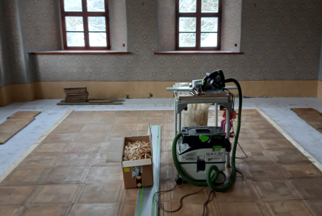 Als erstes begannen am 26. Januar die Parkettleger mit Vorbereitungsarbeiten. Die dafür vorgesehenen rechteckigen Eichenholzparkettstücken (ca. 5 Kubikmeter) müssen in aufwendiger Arbeit einzeln bearbeitet und gesäubert werden.
